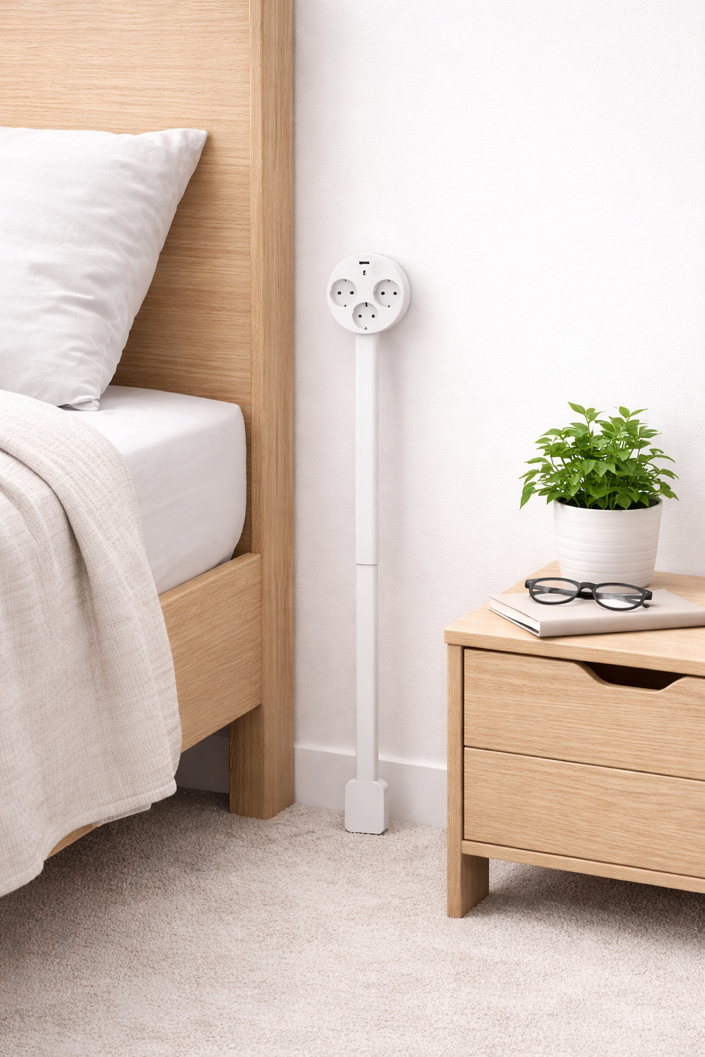 W końcu mam gniazdko przy łóżku bez zaginania kabla. Pasuje idealnie za szafkę.